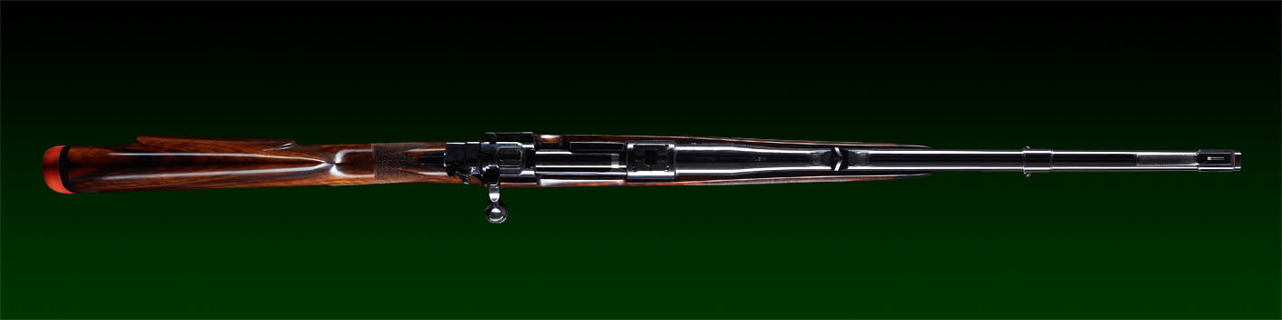 Schaft: Handgefertigter Nussbaumschaft in engl. Stil, mit Deutscher Backe und geradem Schaftrücken, Ebenholzabschluss am Vorderschaft, feine Fischhaut, Stahl Pistolengriff Käppchen, Kunststoff Systembettung, Original Silver Gummischaftkappe (BLO), Tru-Oil Finish.