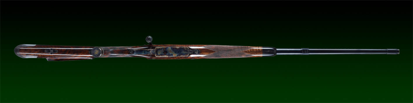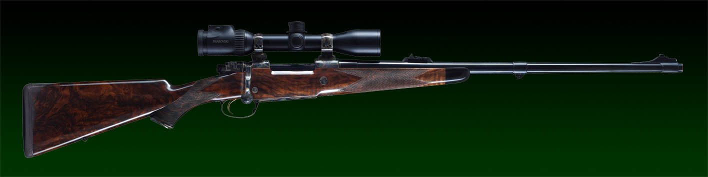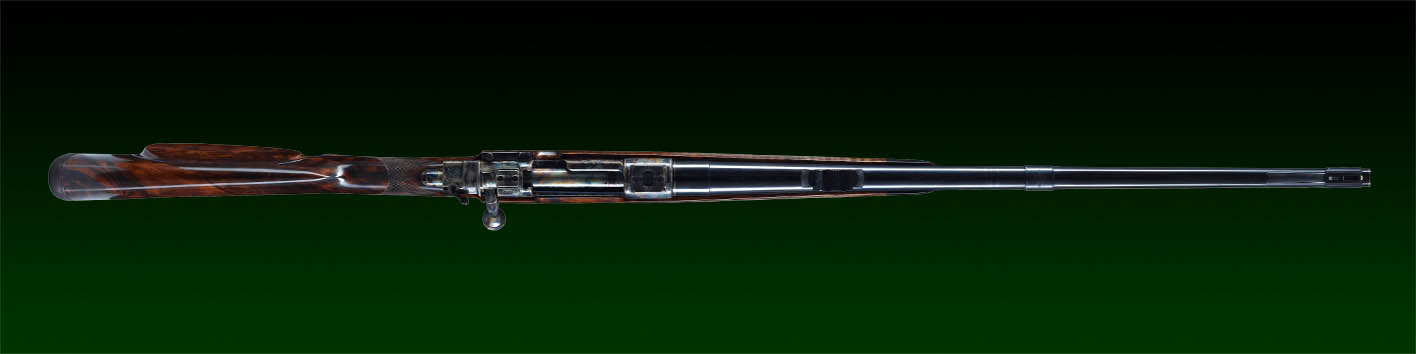 System: M98 Steyr1912, neugefertigter Magnum Magazinkasten, fein eingestellter Recknagel Flintenabzug, flache Sicherung, verlängerter Kammerstängel, Kammergriffkugel umlaufend graviert.