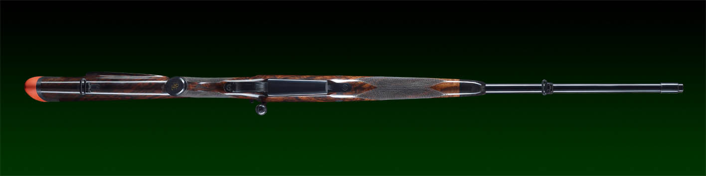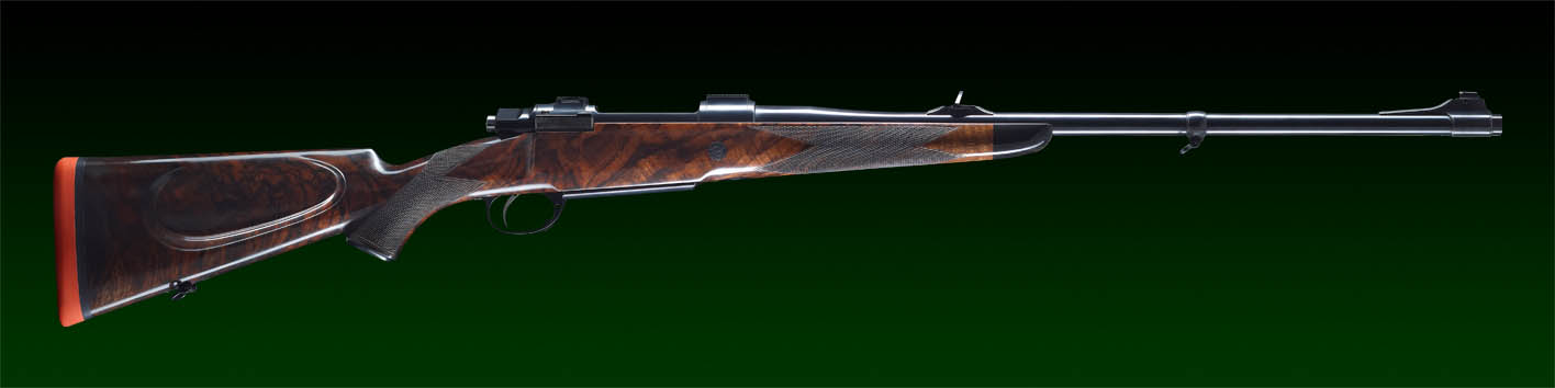 Schaft: Handgeschäfteter Nußbaumschaft in engl Stil, mit Deutscher Backe und geradem Schaftrücken, Büffelhornabschluss am Vorderschaft, feine Fischhaut, Stahl Pistolengriff Käppchen, Kunststoff Systembettung, Original Silver Gummischaftkappe (BLO), Tru-Oil Finish.