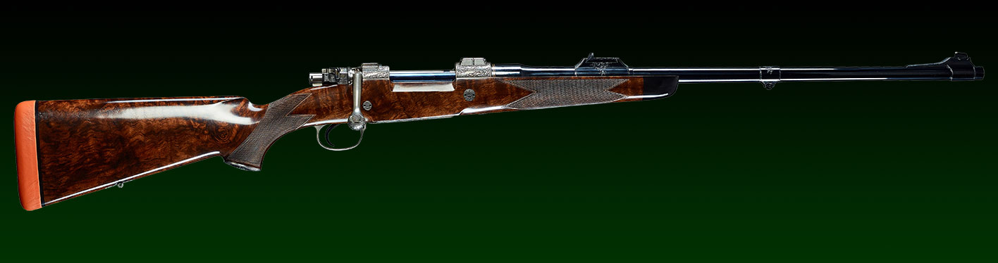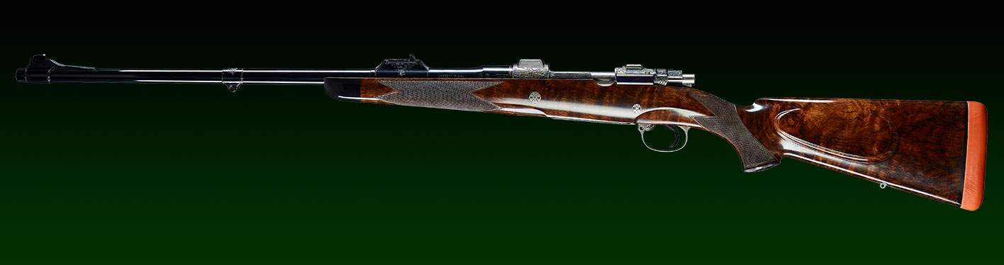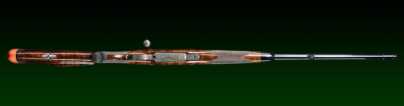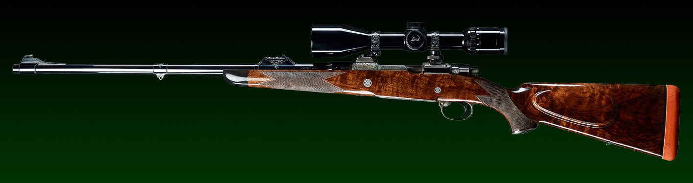 System: M98 DWM, fein eingestellter Recknagel Flintenabzug, flache Recknagel Secura Sicherung, verlängerter Kammerstengel, Kammergriffkugel umlaufend graviert.
