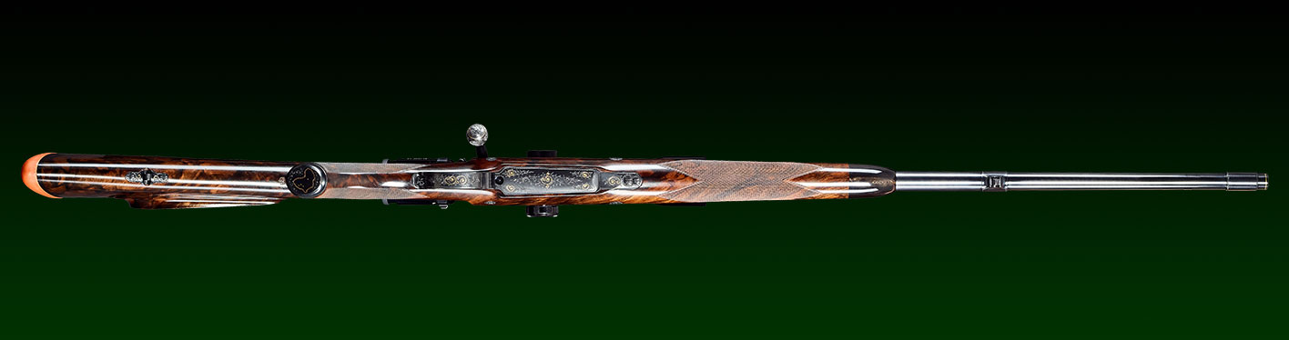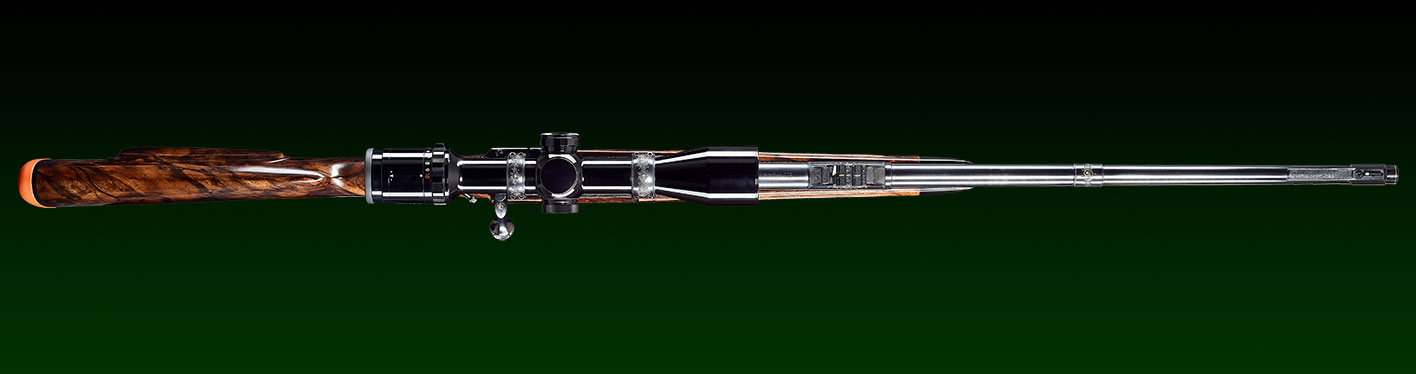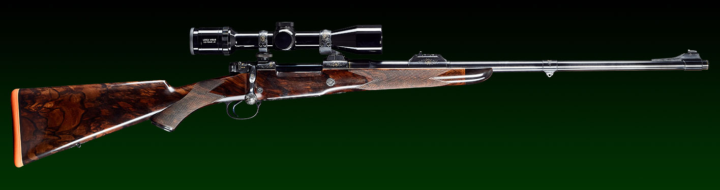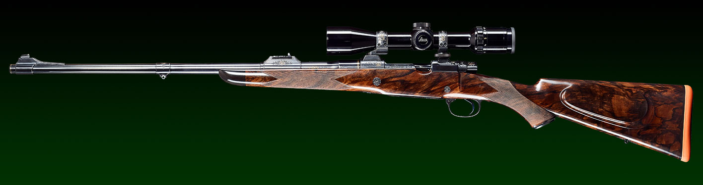 System: M98 DWM, fein eingestellter Recknagel Flintenabzug, flache Recknagel Secura Sicherung, verlängerter Kammerstengel, Kammergriffkugel umlaufend graviert.